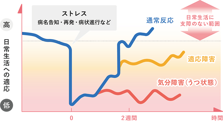がんである現実を前に動揺が長引き、精神的苦痛が非常に強いために、日常生活に支障を来している状態です。不安で眠れなかったり、仕事が手に付かなかったり、人と会うのが苦痛で自宅に引きこもったりしてしまう人もいます。※